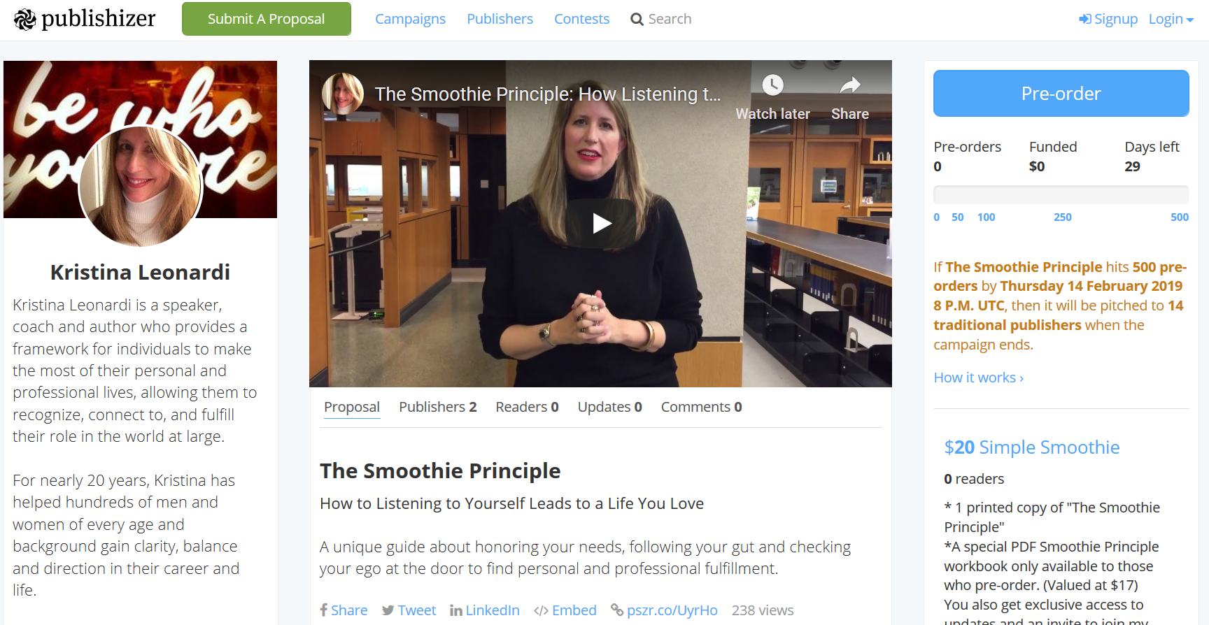SO, this is where you come in . I’ve signed up to do a 30-day book proposal campaign on a crowdfunding platform called Publishizer . I basically need to get 500 pre-orders in order to show interest and enthusiasm for the book and get noticed by the big publishers. And as a thank you for your confidence and interest in The Smoothie Principle , I’m offering some really great bonuses and opportunities to work with me.